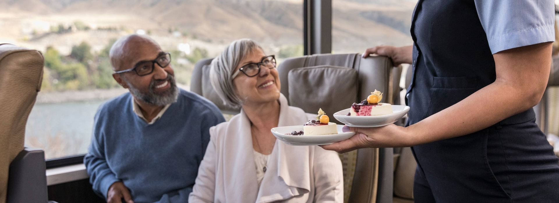 If you choose to upgrade to GoldLeaf Service, you'll enjoy assigned seating in reclining, rotating seats in a custom-designed state-of-the-art bi-level domed coach, which offers panoramic views from its full-length windows, as well as an a la carte breakfast and lunch served in the lower-level private dining room. The domed coach has a spiral staircase and lift to the dome level.