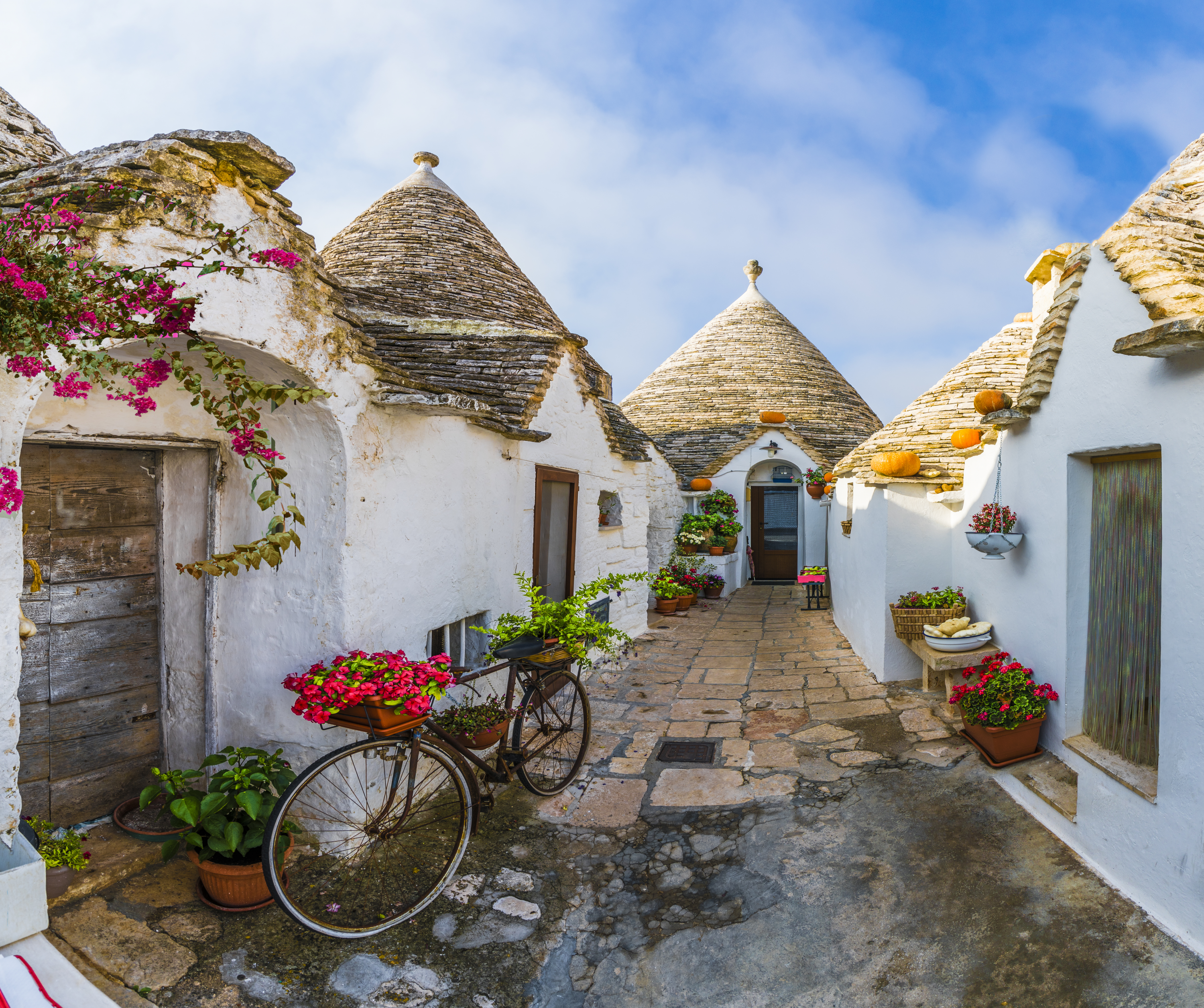 Visit Alberobello with the unique trulli houses, set amidst stunning Tuscan-like countryside.