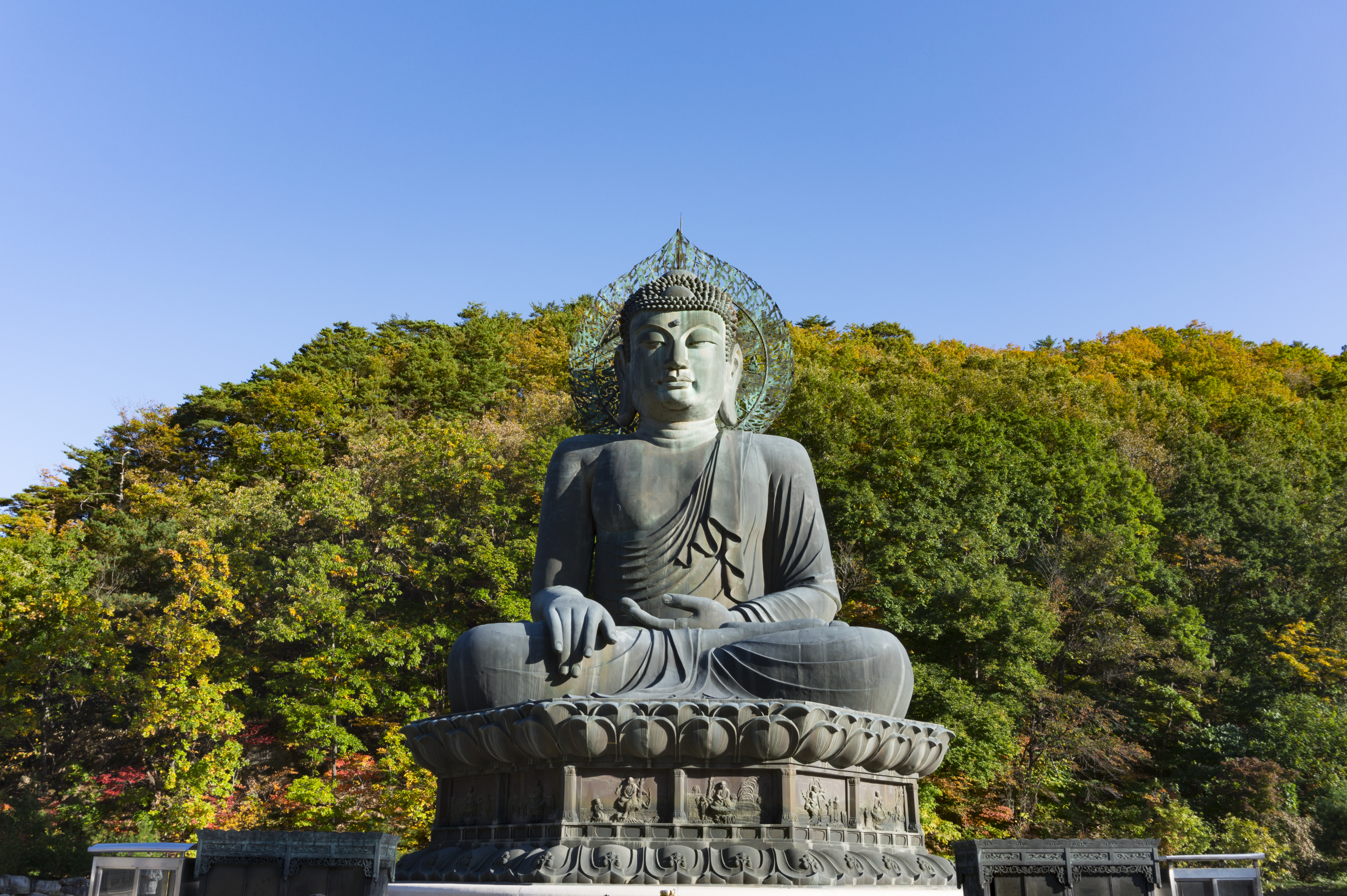 Soon after we enter, we'll see The Great Bronze Buddha, a 14-meter-tall gilt bronze statue a short walk away from the Sinheungsa Temple, that is believed to be the oldest Zen temple in Korea.