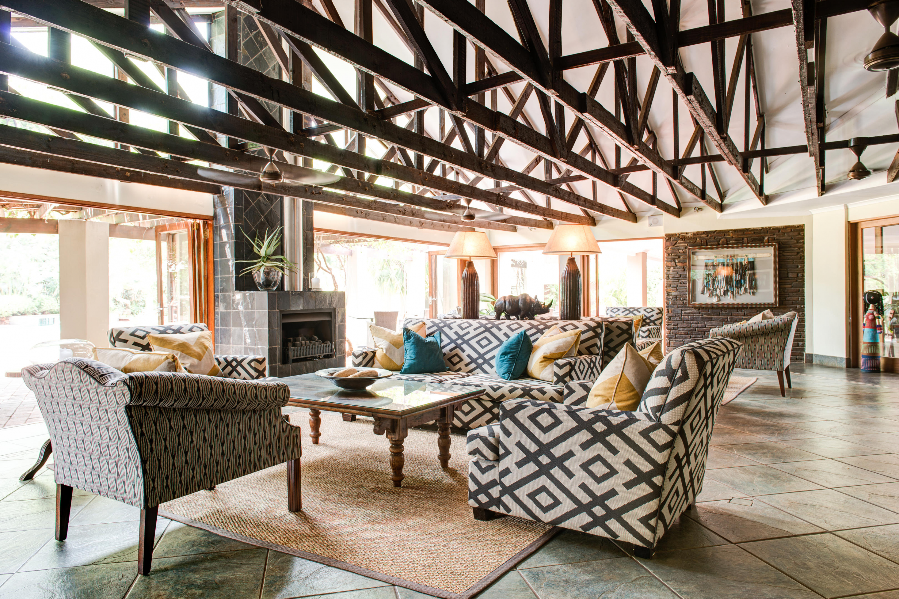The four-star Ghost Mountain Inn has been extending a warm Zululand welcome to guests since 1962. The hotel enchants visitors with its authentic African decor and nightly traditional dance performances, creating a truly magical experience. The expansive, indigenous gardens span over 5 acres, reaching down to the water at the property's boundary – the perfect setting to indulge in a good book. Take a dip in one of the two outdoor pools, both situated in the gardens in front of the hotel, surrounded by umbrellas and loungers. Enjoy a delicious meal at the on-site restaurant, offering both buffet and à la carte options, served in the Dining Room, outdoors on the terrace, or under the clear African sky in their traditional Boma. Unwind with a drink at the bar, which opens onto the patio and offers a selection of delectable drinks, cocktails, and an award-winning wine list. After your adventure-filled days, retreat to your cosy room, each boasting a terrace or balcony with stunning garden views.
